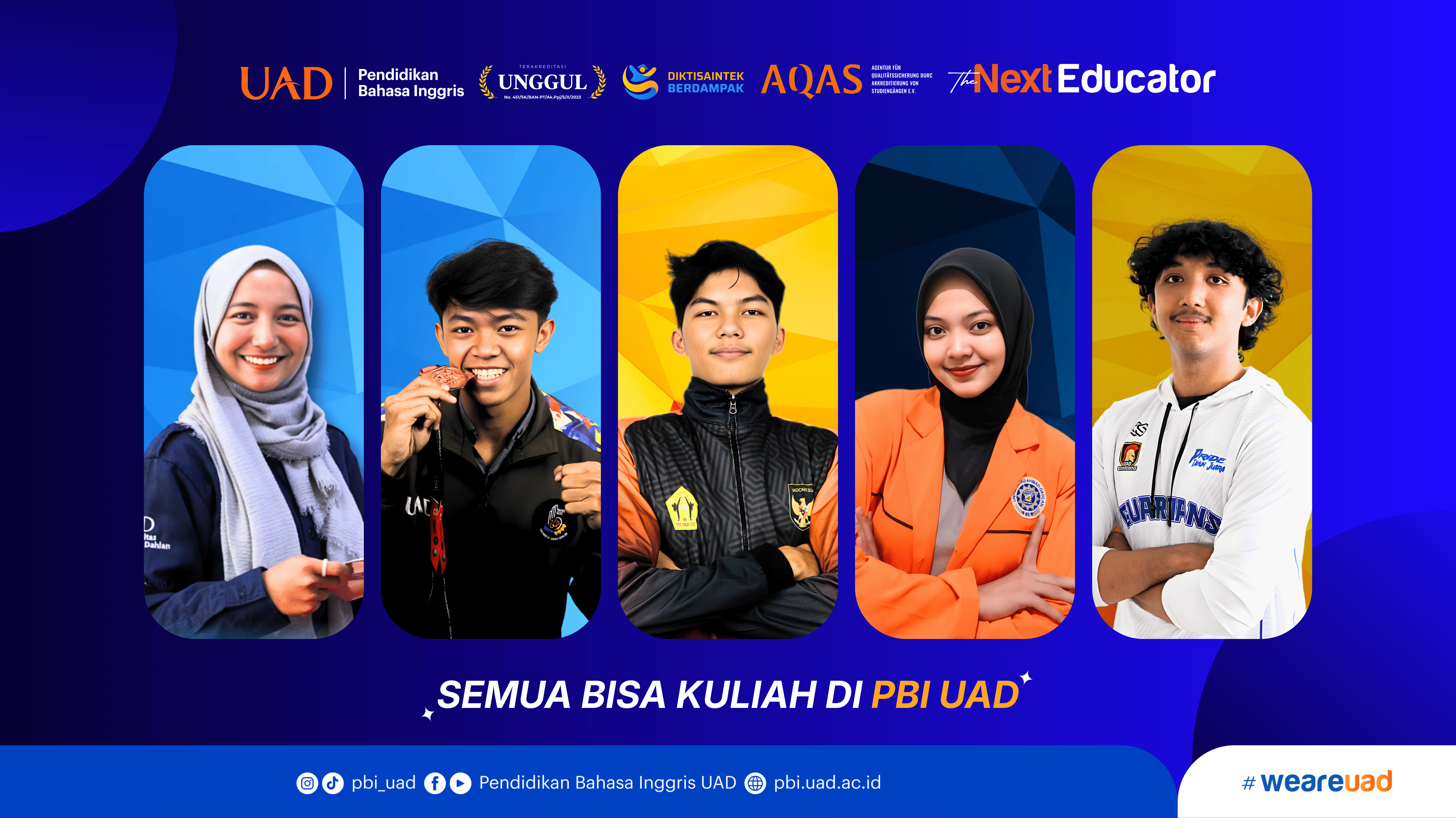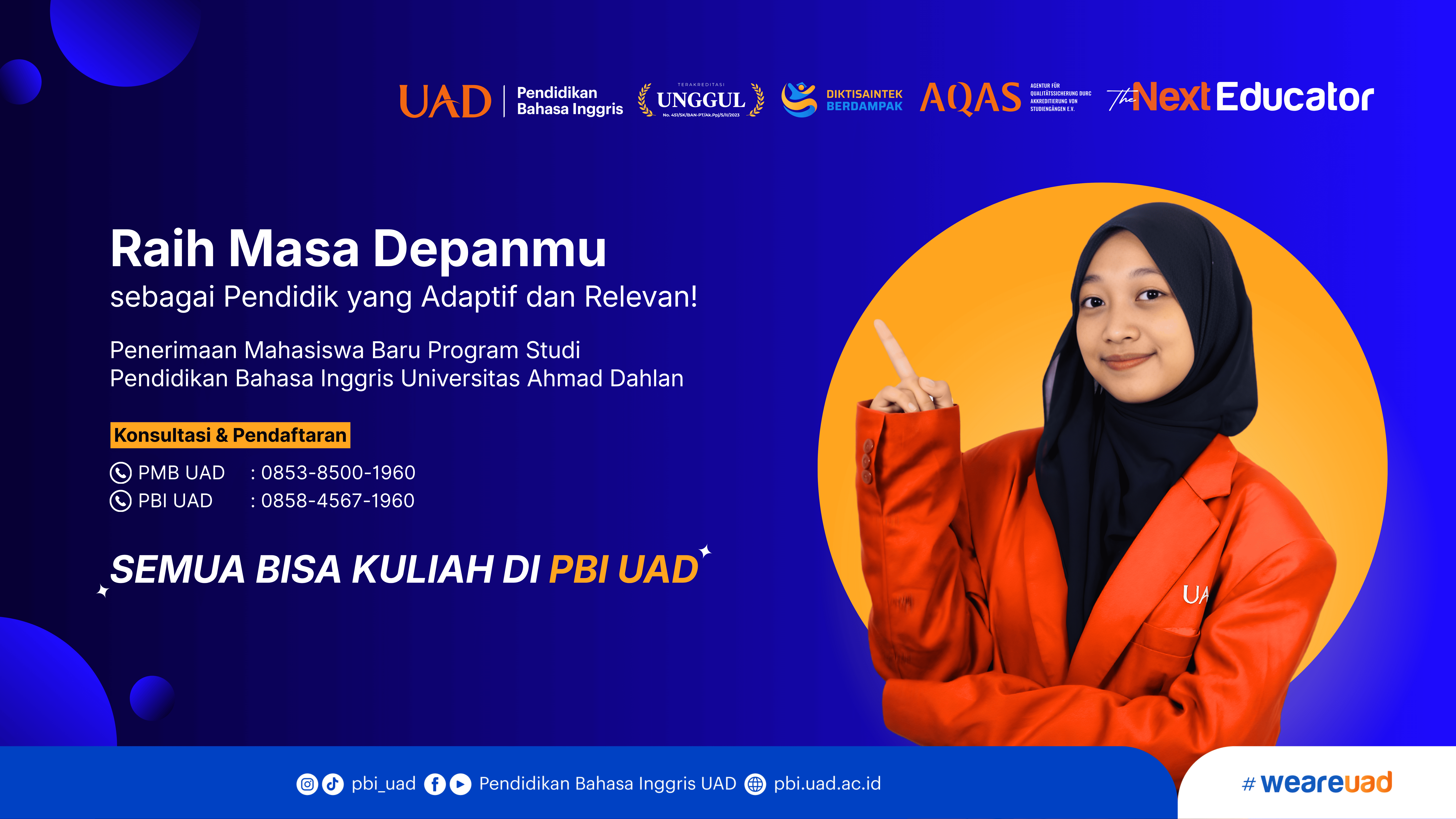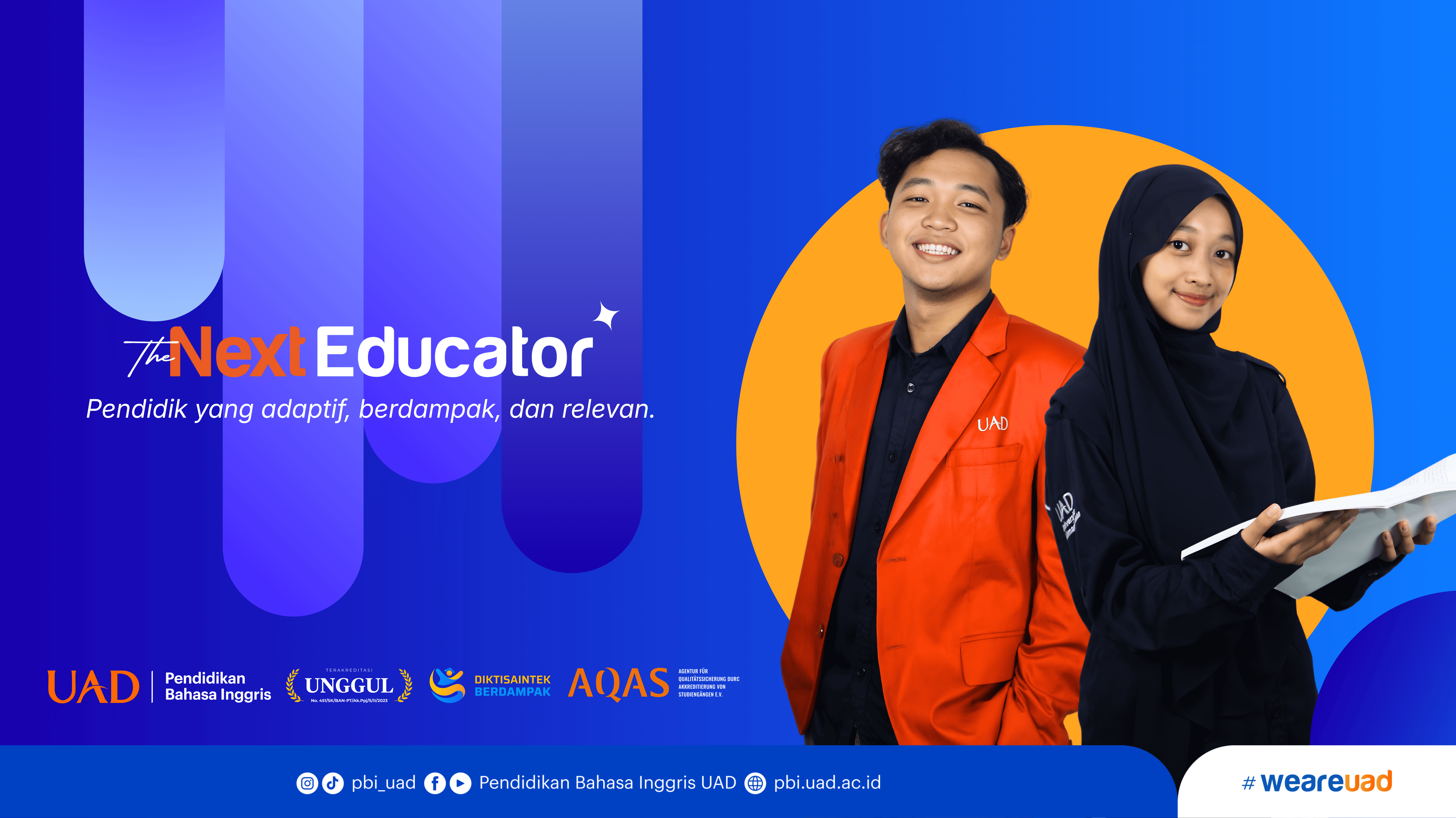 Program Studi Pendidikan Bahasa Inggris Universitas Ahmad Dahlan (PBI UAD) telah 40 tahun lebih ikut serta dalam membangun generasi bangsa. PBI UAD terus dan telah membersamai lintas generasi untuk menjadi pendidik yang handal. Sekian generasi, baik baby boomer, X, Y dan Z telah menempa diri dan menjadi pendidik yang mampu menjawab tantangan perubahan zamannya. Perguruan tinggi hingga beberapa tahun mendatang akan diisi oleh para Gen Z. Gen Z memiliki karakteristik yang khas dan cukup berbeda dengan generasi-generasi sebelumnya. Kreatifitas dan kemampuan teknologi yang mereka miliki menakjubkan tetapi karakter serta mentalitas mereka rentan. PBI UAD menyusun kurikulum pendidikan yang dapat mempertemukan perkembangan teknologi informasi dan nilai-nilai Islam. Dengan bekal tersebut, PBI UAD optimis dapat mencetak lulusan yang kompeten sekaligus berahlak. Mari bersiap menjadi “The Next Educator”.
