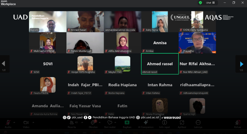 Yogyakarta – Himpunan Mahasiswa Program Studi (HMPS) Pendidikan Bahasa Inggris (PBI) Universitas Ahmad Dahlan (UAD) EDSA menyelenggarakan Sarasehan Tindak Lanjut Aspirasi Keluarga Besar Mahasiswa (KBM) PBI Tahun Akademik 2025/2026. Kegiatan ini berlangsung pada Sabtu, 27 Desember 2025, pukul 09.30 WIB–selesai, secara daring melalui Zoom Meeting. Kegiatan ini diikuti oleh dosen, mahasiswa, dan tenaga kependidikan PBI.