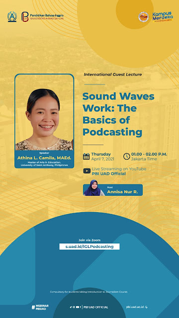 Pada agenda International Guest Lecture, Prodi Pendidikan Bahasa Inggris, UAD mengundang Athina L. Camila, MAEd dari University of Saint Anthony, Filipina sebagai pembicara pada Kamis (7-04-2022). Tema kuliah tamu ini adalah “Sound Waves Work: Discussion About The Basics of Podcasting” dengan peserta mahasiswa PBI Kelas Introduction to Journalism. Kenapa podcasting?