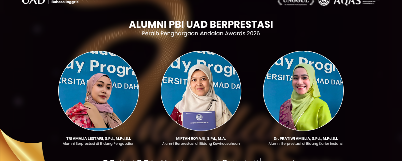 Program Studi Pendidikan Bahasa Inggris (PBI) Universitas Ahmad Dahlan (UAD) kembali menorehkan prestasi melalui capaian para alumninya dalam ajang Andalan Awards 2026. Tiga alumni PBI UAD berhasil meraih penghargaan pada kategori berbeda. Penghargaan tersebut diberikan sebagai bentuk apresiasi atas kontribusi dan kiprah mereka di bidang masing-masing.